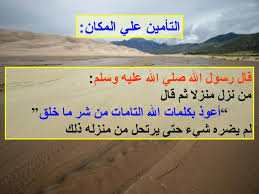 6. التأمين علي المكان : قال رسول الله صلي الله عليه وسلم : من نزل منزلا ثم قال ” أعوذ بكلمات الله التامات من شر ما خلق “ لم يضره شيء حتى يرتحل من منزله ذلك