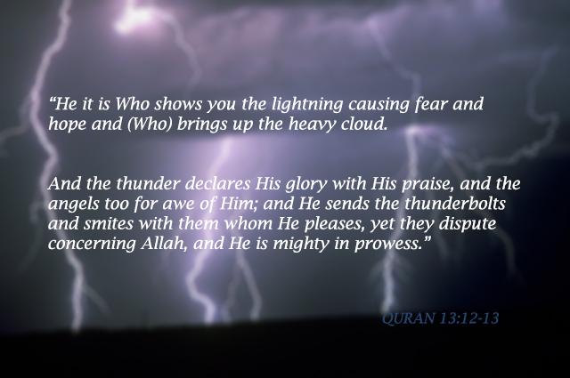 (هُوَ الَّذِي يُرِيكُمُ الْبَرْقَ خَوْفًا وَطَمَعًا وَيُنشِئُ السَّحَابَ الثِّقَالَ ، وَيُسَبِّحُ الرَّعْدُ بِحَمْدِهِ وَالْمَلَائِكَةُ مِنْ خِيفَتِهِ وَيُرْسِلُ الصَّوَاعِقَ فَيُصِيبُ بِهَا مَن يَشَاءُ وَهُمْ يُجَادِلُونَ فِي اللَّهِ وَهُوَ شَدِيدُ الْمِحَالِ) الرعد 12-13